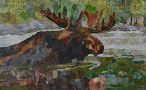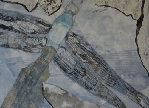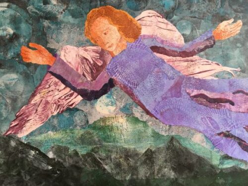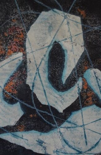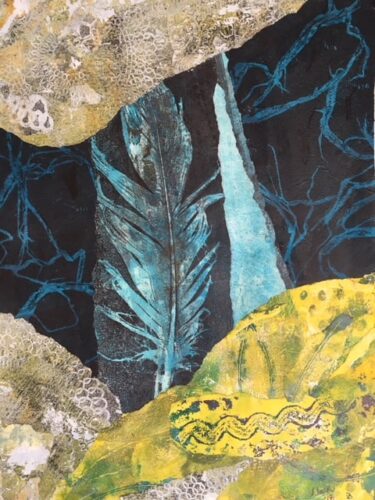 The mono-prints are made using a gel-plate and acrylic paint, often embellished with pencil crayon. A mat is included. Black metal frame/glass an option for an additional cost.