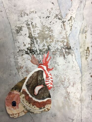 Each collage is made from gel-plate mono-prints, and is mounted on hardboard. They are framed with a charcoal black wooden frame. Shipping is included for Canadian orders.